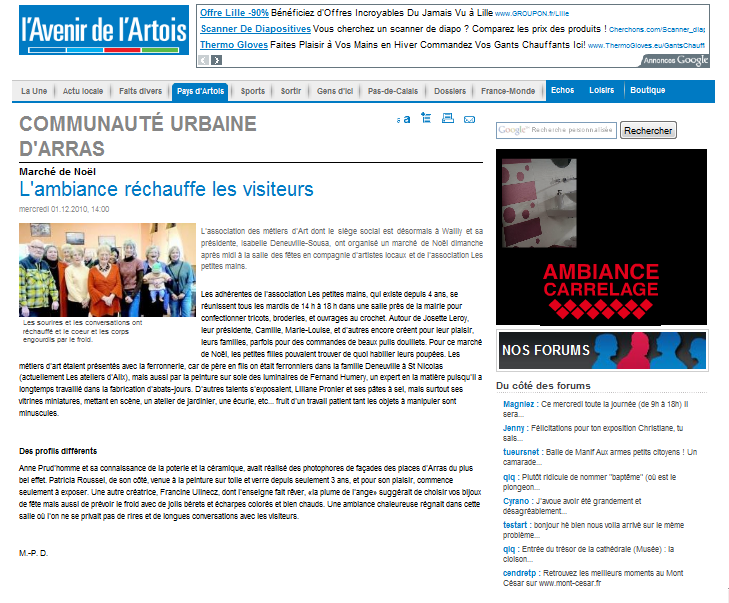 Parution dans « L’avenir de l’artois » le 15 décembre 2010